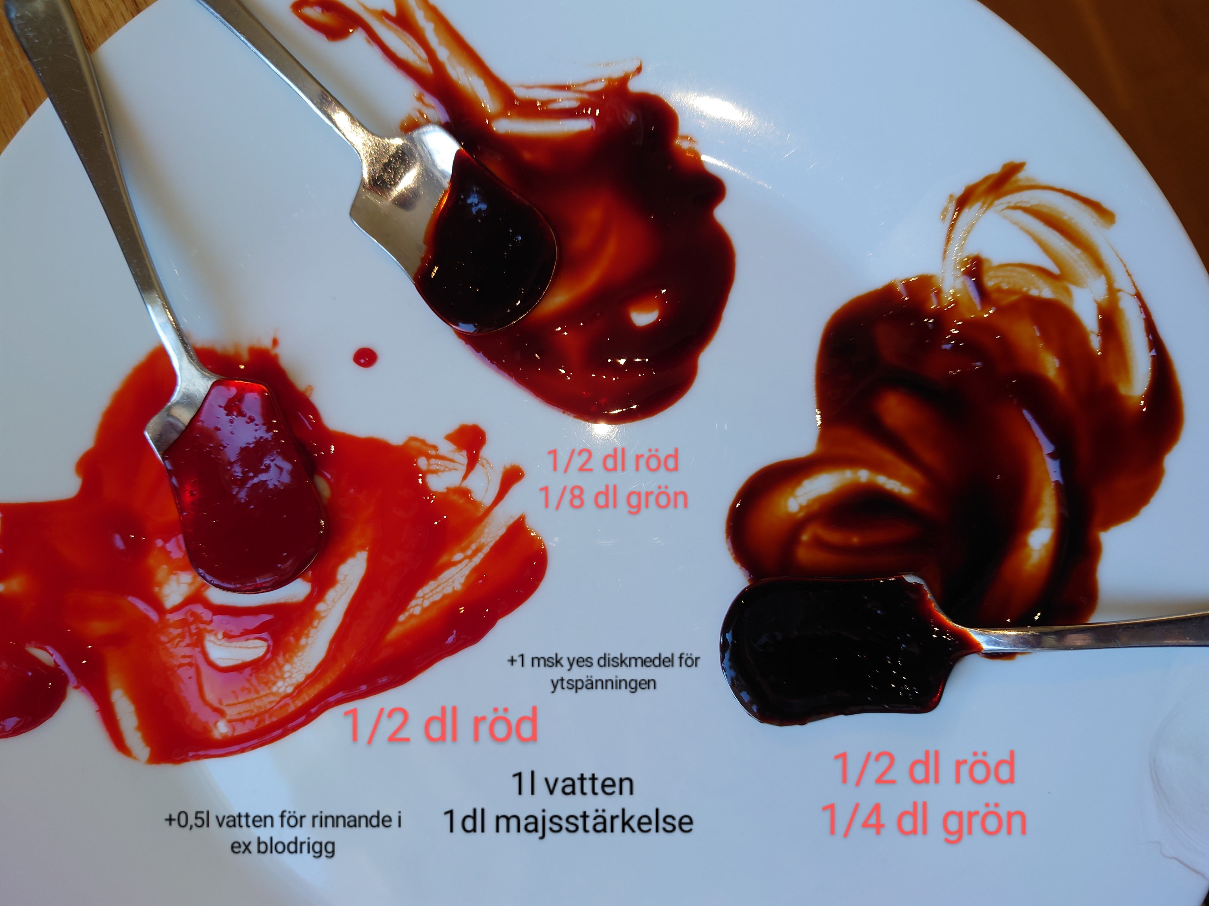 På bilden ser ni en sammanfattning av mitt recept för blodet jag använder i riggar för effekter. För sårsminkning som behöver mindre blod brukar mörkare fejkblod från Kryolan vara bättre.